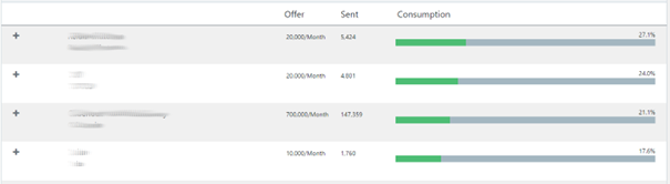 This screen displays for each Policy the associated offer, the number of sending made during the offer period, and the consumption gauge.