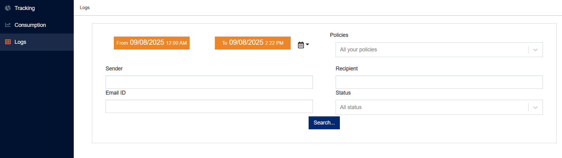 Here, you can filter your logs by date, sender, email ID, policies, recipient and email status.