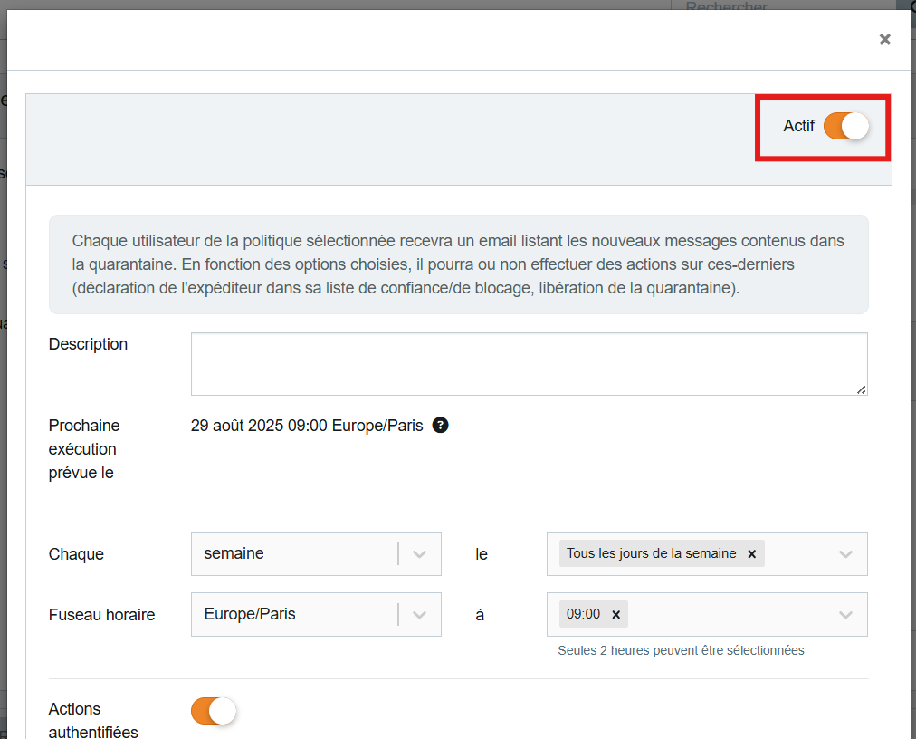 En tant qu'administrateur, vous êtes en mesure d'activer ou de désactiver l'envoi du rapport de quarantaine pour tous les utilisateurs d'un domaine ou individuellement.